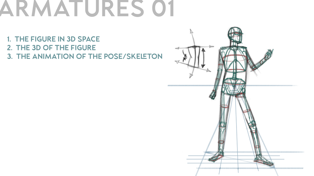 Part 1 of Anatomy Figure Drawing involves placing the skeleton within the armature. The armature is the skeleton, but a simplified version, almost like an inflated stick figure. It is the exact size of the skeleton, and nicely accommodates the skeleton within its contained space.